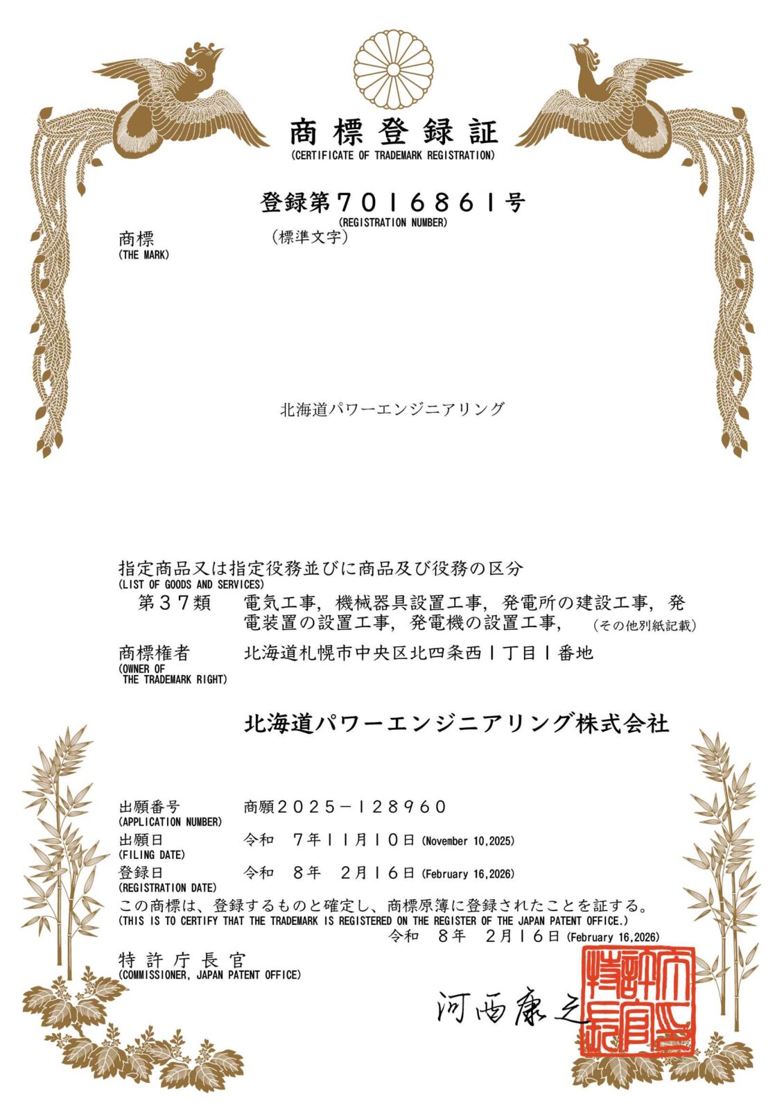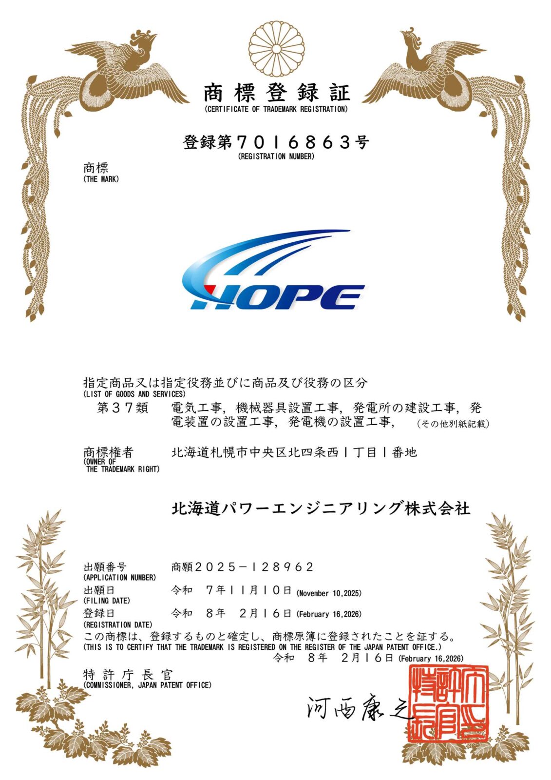 この度、当社が特許庁に出願していた「北海道パワーエンジニアリング」、社名略称「パワーエンジ」および「シンボルマーク(HOPE)」について、令和8年2月16日に商標登録されましたことをお知らせいたします。